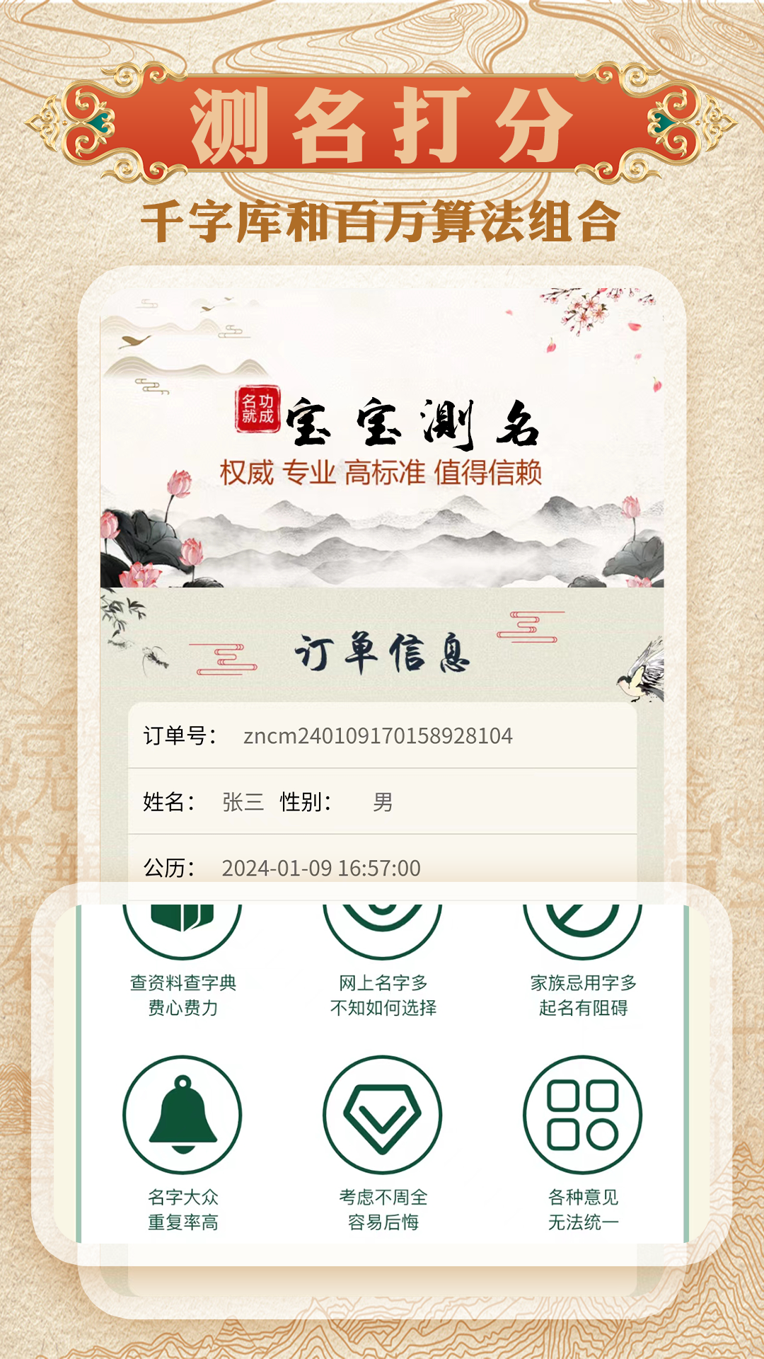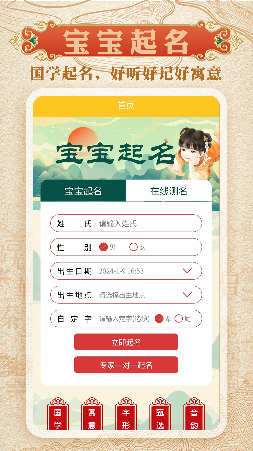 在起名方面,它提供了多种起名方式。大家可以根据姓氏、性别、出生时间、生辰八字等信息进行个性化起名。系统会结合传统姓名学原理,考虑五行相生相克、音韵美感等因素,生成多个符合要求的名字供大家选择。还能根据特定的寓意来起名,比如希望名字寓意吉祥如意、事业有成等,软件都能快速给出合适的方案。测名功能也毫不逊色,输入想要分析的名字后,软件会从多个维度进行评估。它会分析名字的三才五格,解读其数理暗示;还会从字义、音韵等方面考量名字的整体协调性,给出详细的评分和分析报告,让大家清楚了解名字的优势和不足。