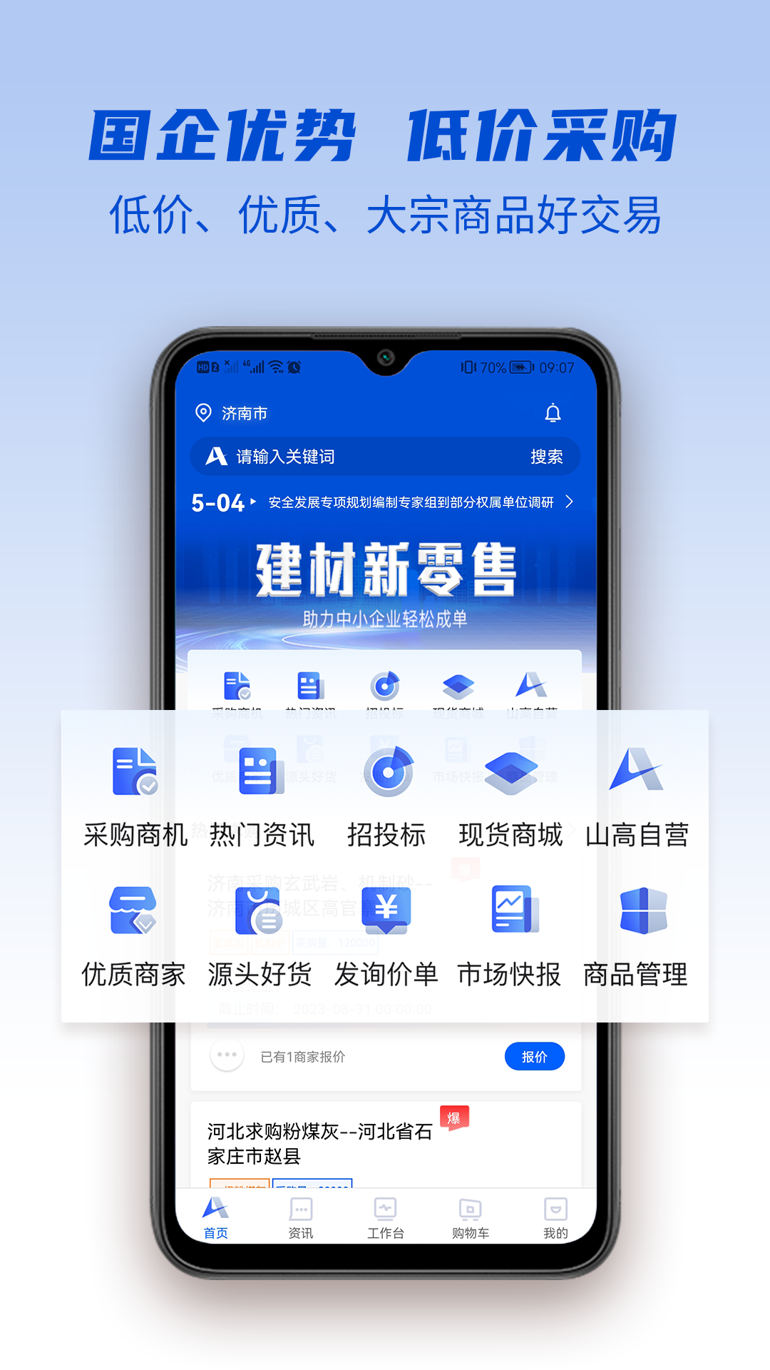 山高材料平台是一款专注于大宗建材与工业原材料交易的数字化B2B平台,致力于为采购和供应双方提供一站式、全流程的线上贸易解决方案。无论是大型工程项目、工装需求,还是家庭装修,平台都能为大家提供高效、可靠的材料采购与服务支持,让复杂的交易流程变得简单而顺畅。